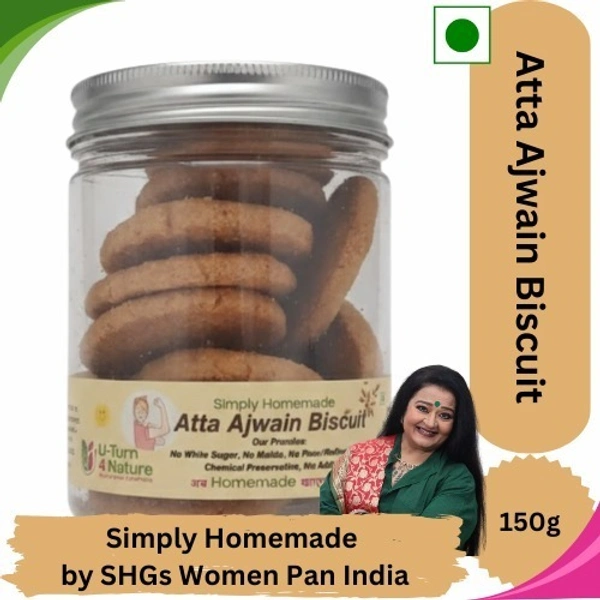 U-Turn4Nature Atta Ajwain Biscuits are made using a simply homemade process by Rural Women Self-Help Groups (SHGs). Enriched with desi ghee, ajwain (carrom seeds), and desi khand, these biscuits offer a perfect balance of taste and wholesome nutrition—just like snacks made at home.