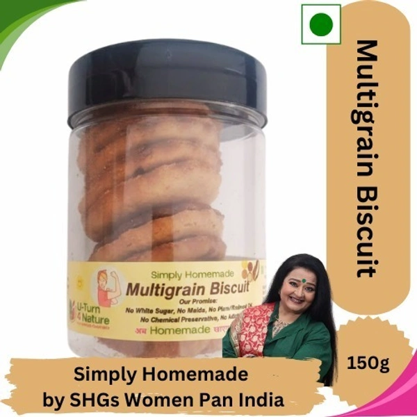 U-Turn4Nature Multigrain Biscuits are crafted using a 100% homemade process by Rural Women Self-Help Groups (SHGs). Made with a nutritious blend of multigrain flour (wheat, oats, ragi, jowar, bajra, maize & barley), naturally sweetened with desi khand and jaggery powder, and enriched with butter and flaxseeds, these biscuits deliver authentic taste and balanced nourishment—just like homemade snacks from your village kitchen.