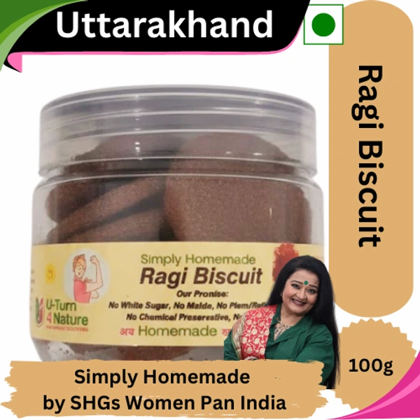 U-Turn4Nature Ragi Biscuits are made using time-tested homemade methods by Rural Women Self-Help Groups (SHGs). These biscuits bring together the goodness of finger millet (ragi), desi ghee, and natural sweeteners—just like homemade treats from your village kitchen.