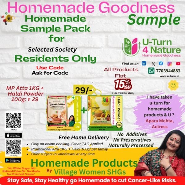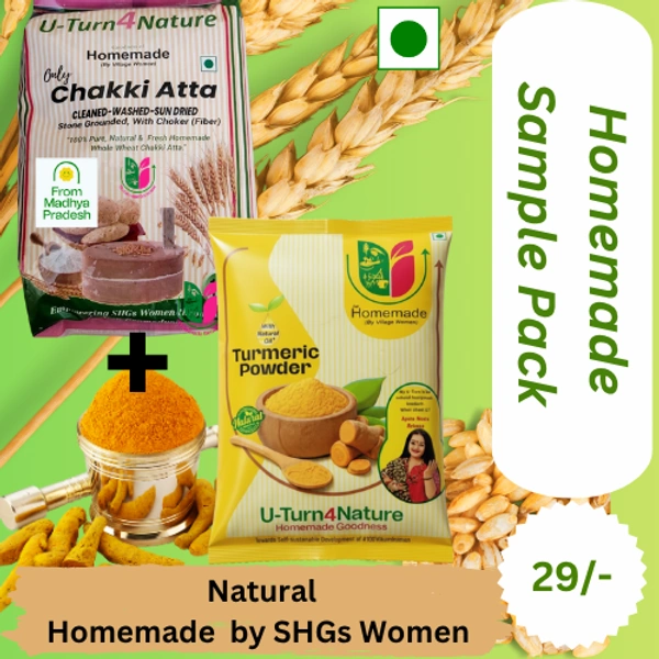 Sample Pack MP Chakki Wheat Atta 1kg+ Haldi Powder 100g = Rs.29. Ask for Code